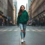 I learned the hard way that color coordination is everything in streetwear. My favorite combo involves a cream or beige hoodie with dark wash jeans and white sneakers. The contrast creates visual interest without trying too hard. For a bolder look, I’ll rock a sage green hoodie with black jeans and matching green accents on my kicks.